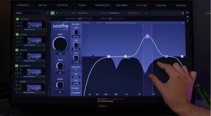 Soothe Live tackles some of the fundamental problems in live mixing. Effective on individual channels and busses, it’s a fast way to combat resonances, and a remedy to uneven tonal balance across the frequency spectrum. Use it to even out low-mid frequencies or tame bright instruments.